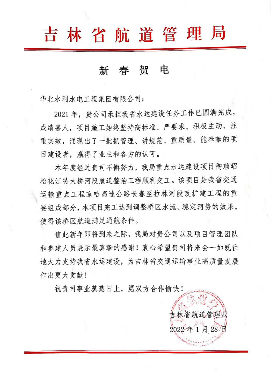更新时间: 点击:9491 所属栏目:集团要闻 Update Time: Hits:9491 Belong Column:2022年1月28日,我司收到吉林省航道管理局新春贺电。在贺电中,管理局对我司完成的陶赖昭松花江特大桥河段航道整治工程提出高度表扬,并对我司以及本项目的管理团队及参建人员表示最真挚的感谢。